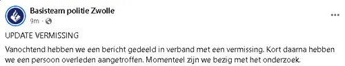 Gisteren meldde de politie de urgente zoektocht naar een 63-jarige Zwollenaar. De politie sprak van een urgente vermissing. De man zou vrijdag zijn gaan hardlopen en is niet teruggekeerd. Ook vanmorgen meldde de politie de zoektocht naar de man op facebook. Dit bericht werd even later verwijderd en geactualiseerd met de vondst van een lichaam. De politie doet onderzoek naar de oorzaak van het overlijden van de man.