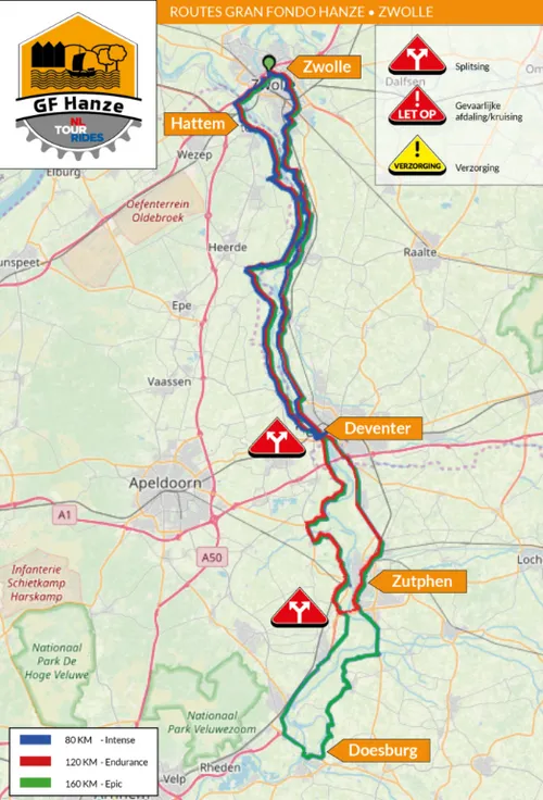 De Gran Fondo Hanze kent drie afstanden; 80 km (Intense), 120 km (Endurance) en 160 km (Epic). De GPX routes zijn per mail naar de de deelnemers gestuurd die zich al hebben ingeschreven.