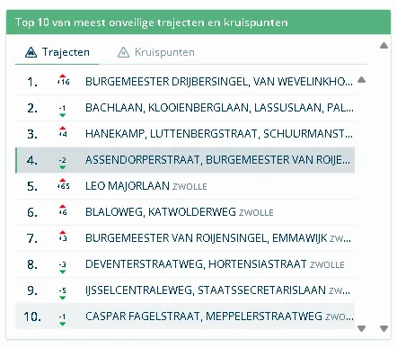 In Zwolle moet je niet zijn op de Burgemeester Drijbersingel en de Bachlaan waar wordt gekruist met de Kooienberglaan en Lassuslaan. De Top 10 wordt compleet gemaakt door de Leo Majorlaan, Blaloweg, Deventerstraatweg, IJsselcentraleweg en de Meppelerstraatweg.