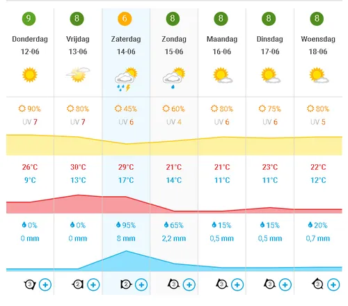 Na een relatief koele periode stijgt de temperatuur woensdag al naar 19 tot 23 graden. Donderdag gaat die verder omhoog naar 24 tot 29 graden in de middag. De zon schijnt volop en er is sprake van wat sluierbewolking, bij een matige wind uit het (zuid)oosten.